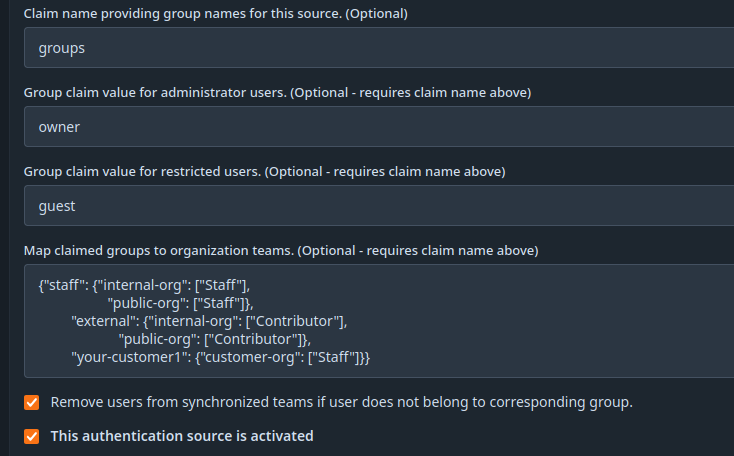 {"staff": {"internal-org": ["Staff"], "public-org": ["Staff"]}, "external": {"internal-org": ["Contributor"], "public-org": ["Contributor"]}, "your-customer1": {"customer-org": ["Staff"]}} - optional: Check the Remove users from synchronized teams if user does not belong to corresponding group. box for synchronized teams. This will remove users from a role / team if they are removed on keycloak side. Be careful! If you screw up your mapping, the role- and team-membership will also be removed.