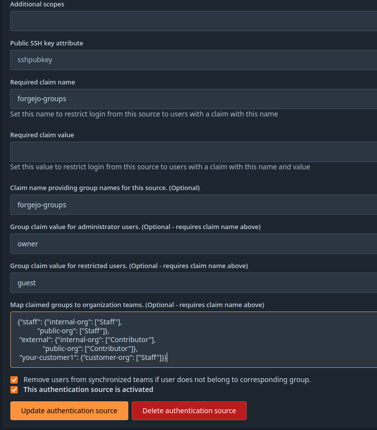 {"staff": {"internal-org": ["Staff"], "public-org": ["Staff"]}, "external": {"internal-org": ["Contributor"], "public-org": ["Contributor"]}, "your-customer1": {"customer-org": ["Staff"]}} - Optional: Check the Remove users from synchronized teams if user does not belong to corresponding group. box for synchronized teams. This will remove users from a role / team if they are removed on keycloak side. Be careful! If you screw up your mapping, the role- and team-membership will also be removed.